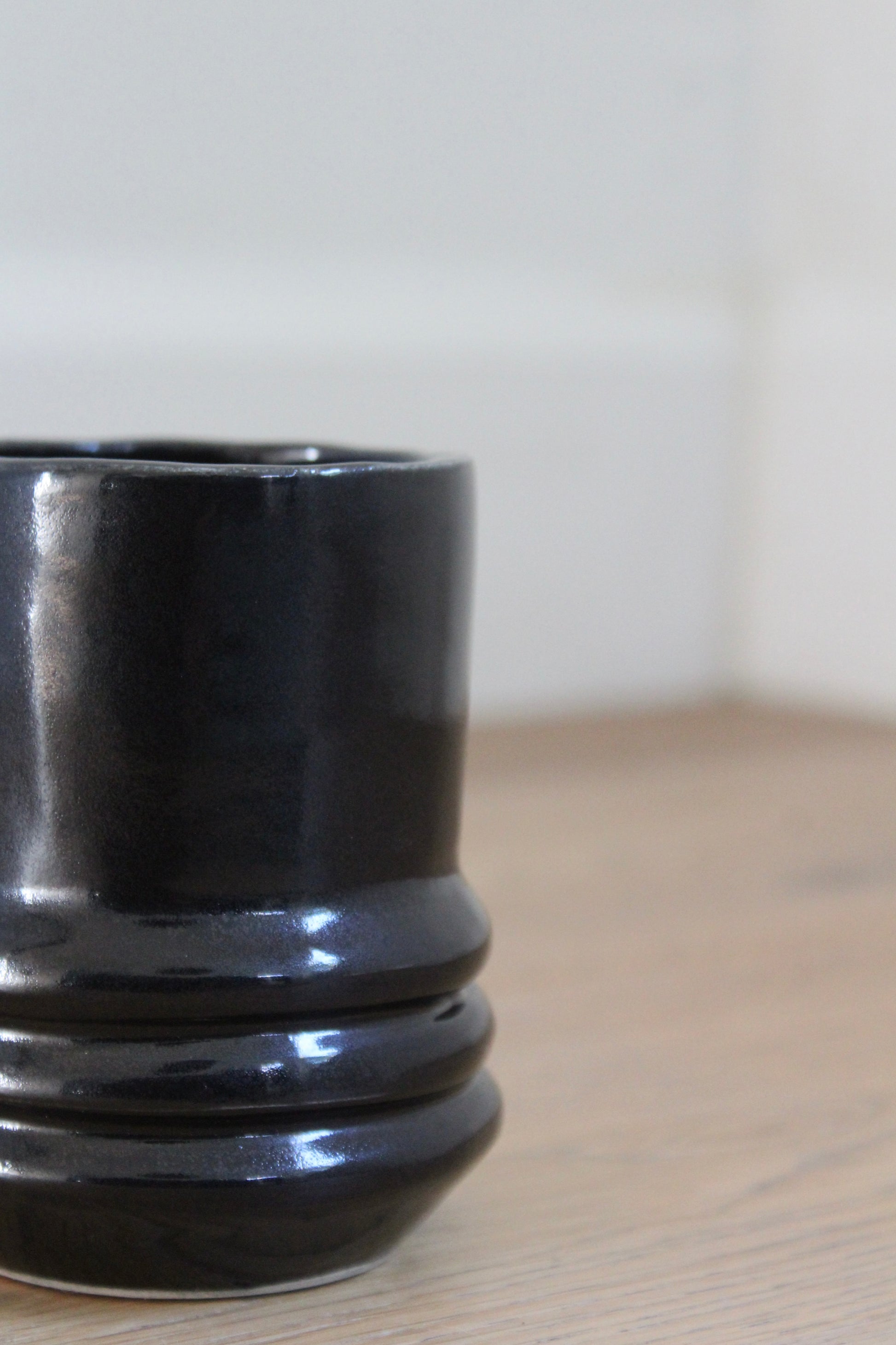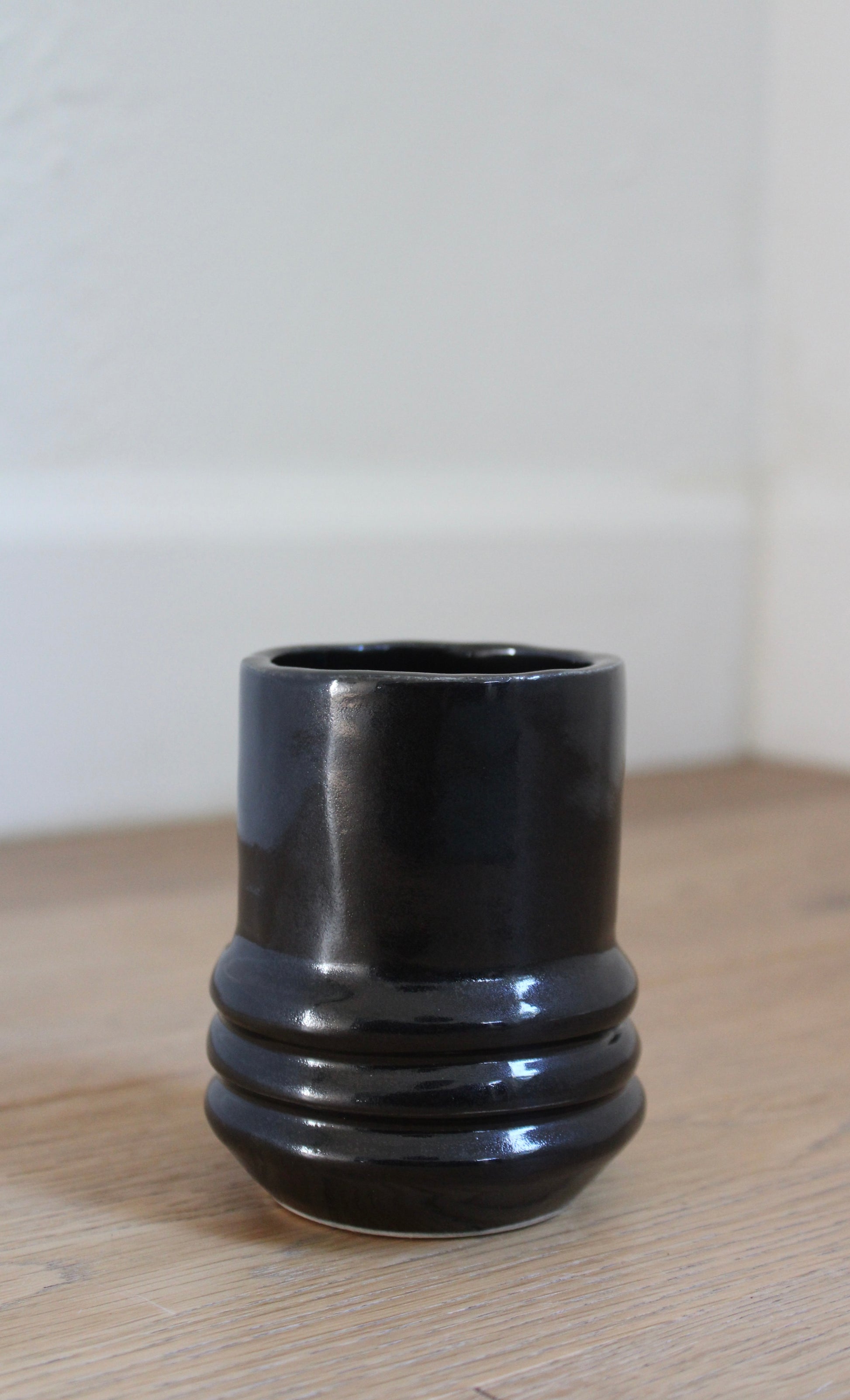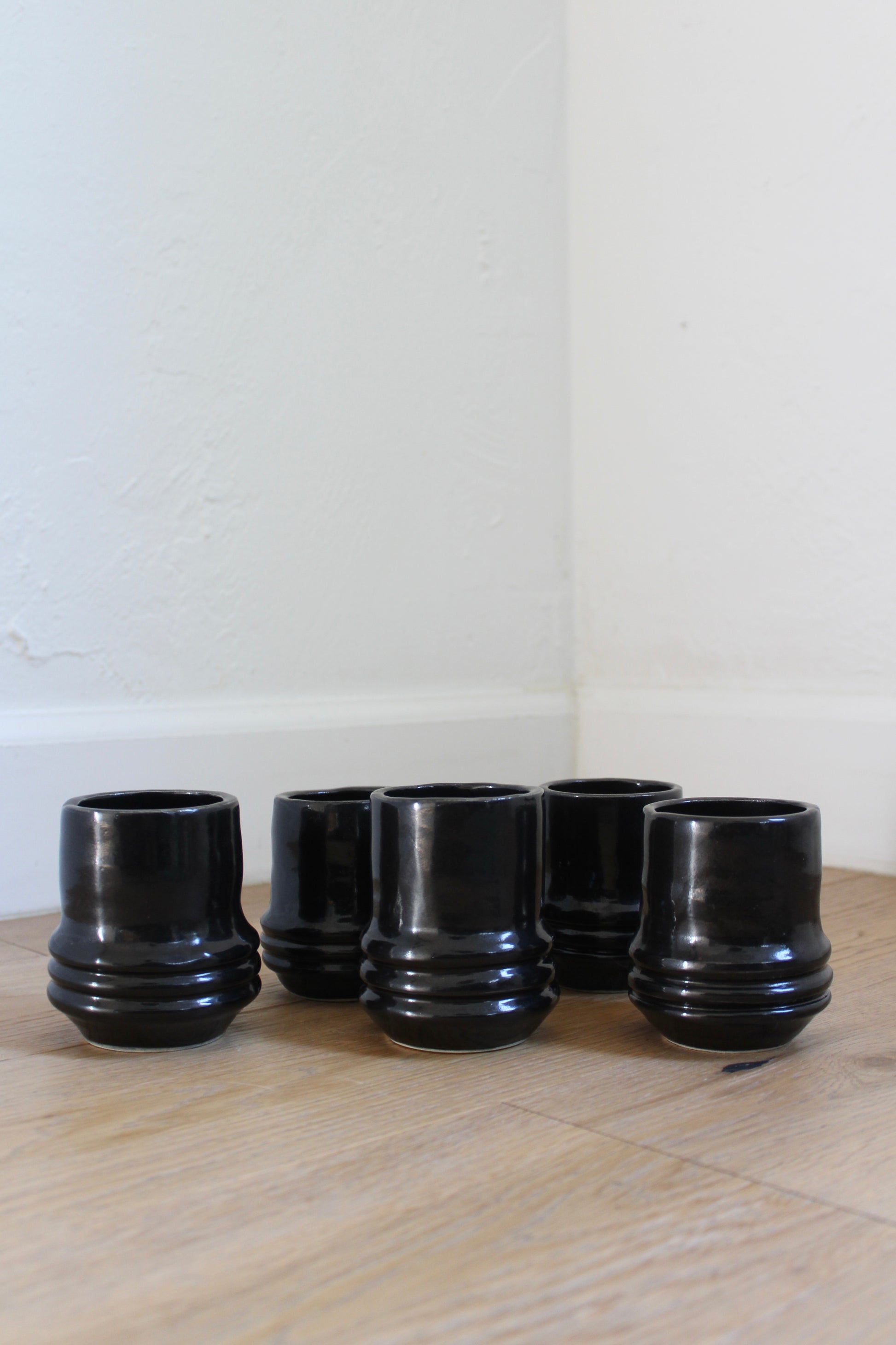 They are black banded cups that hold about 4 oz each. Hand trimmed and molded bands on each cup.