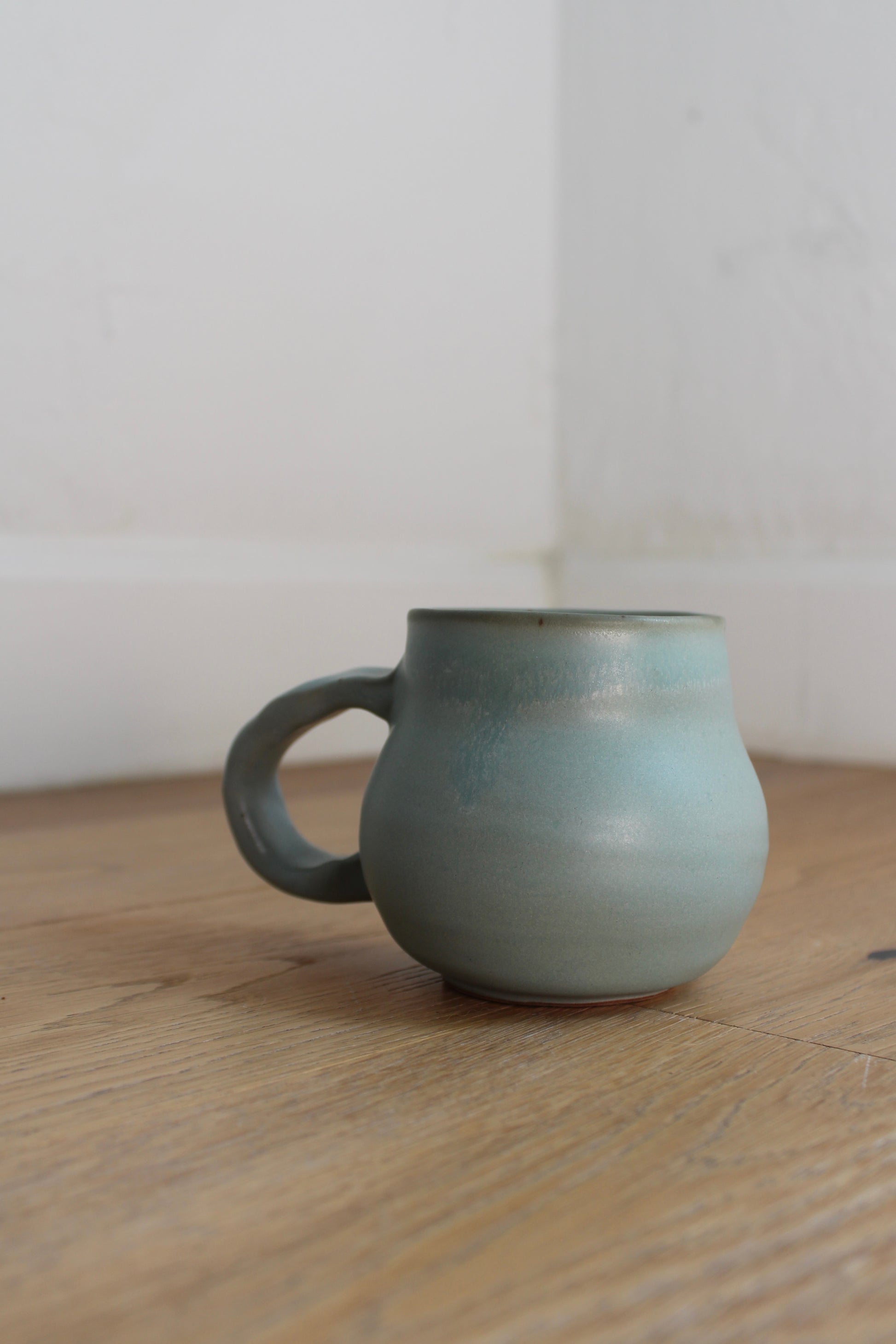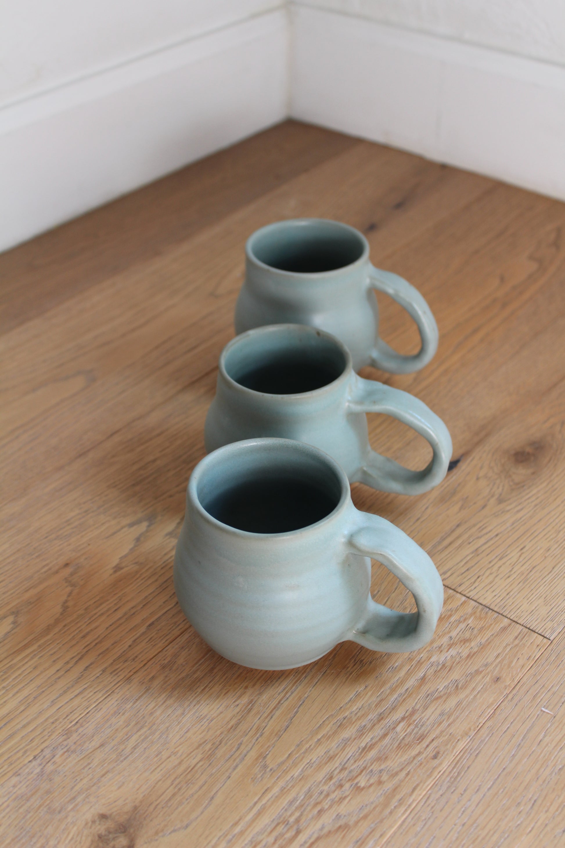 These mugs are in the carpinteria blue color. They have a tear drop shape that is whimsical.
