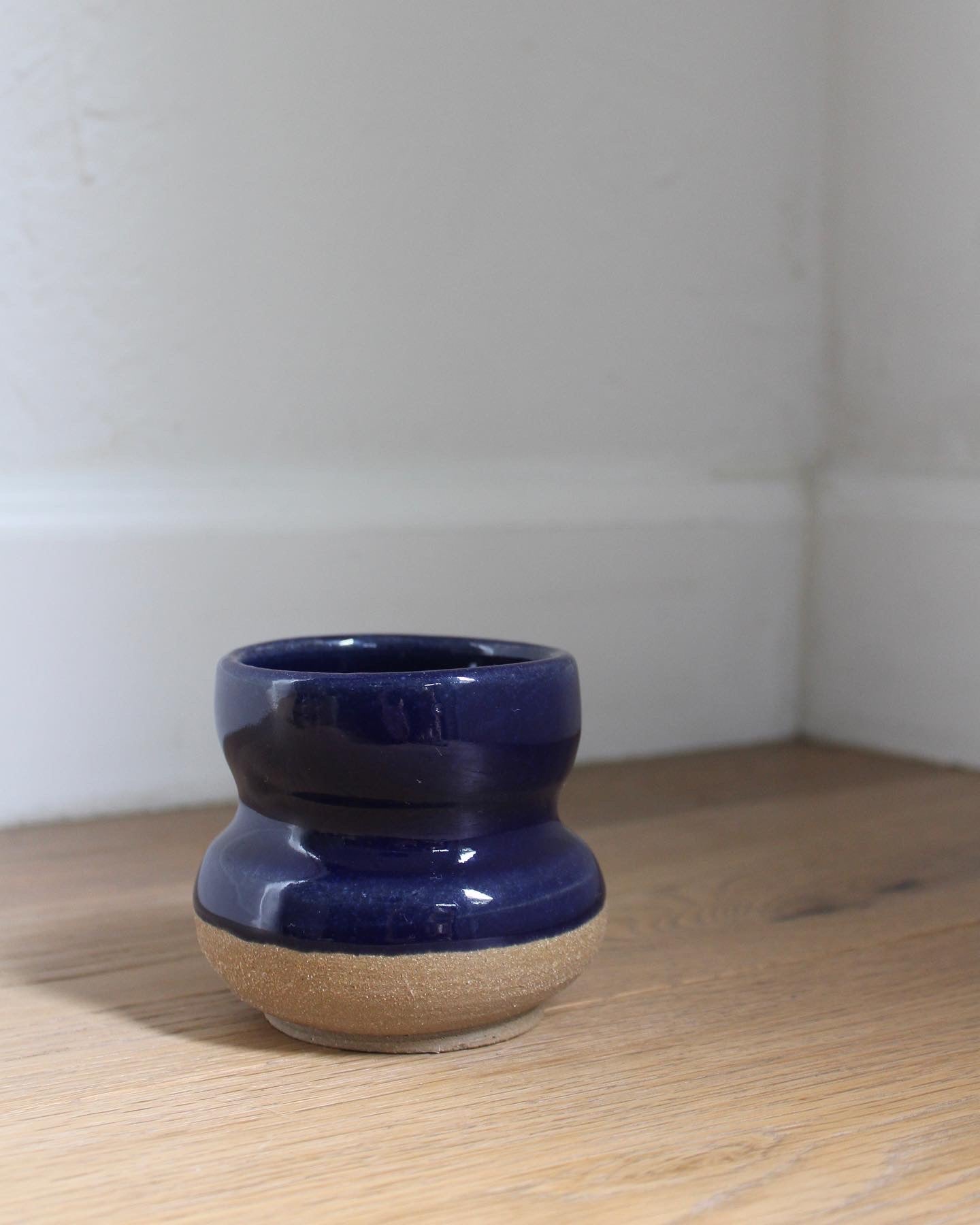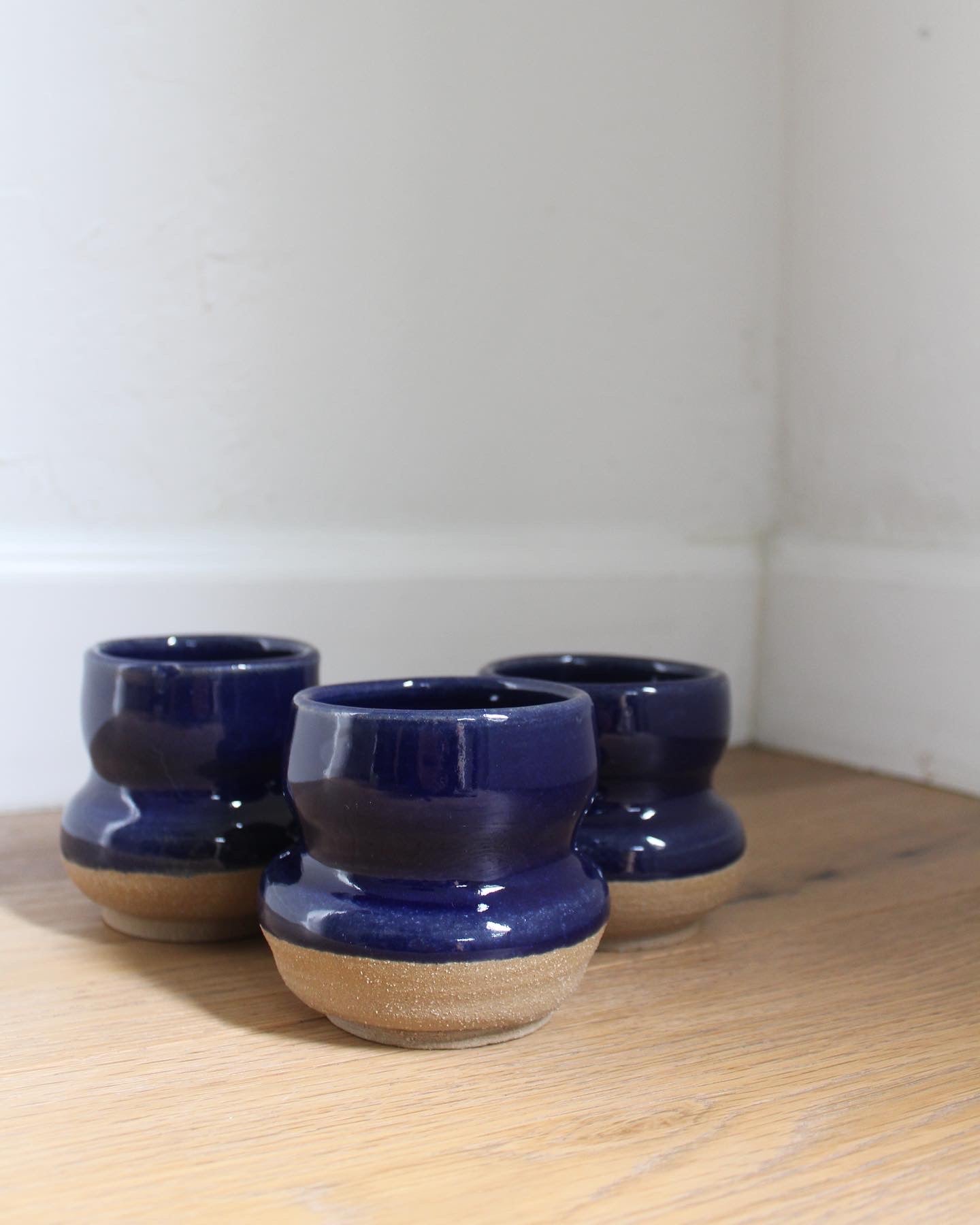 These cups can hold about 5oz. of liquid. They are made with Moroccan Clay which fires a light tan. The royal blue glaze pops on this clay!